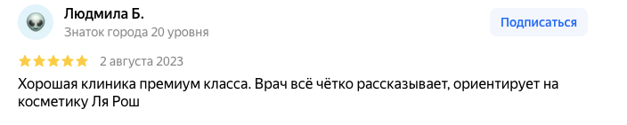 Хорошая клиника премиум класса. Врач всё чётко рассказывает, ориентирует на косметику Ля Рош