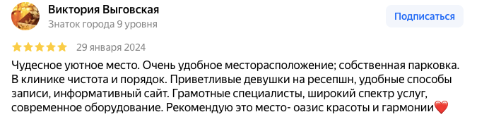 Чудесное уютное место. Очень удобное месторасположение; собственная парковка. В клинике чистота и порядок. Приветливые девушки на ресепшн, удобные способы записи, информативный сайт. Грамотные специалисты, широкий спектр услуг, современное оборудование. Рекомендую это место- оазис красоты и гармонии❤️