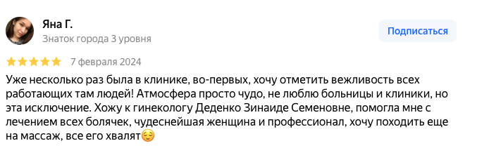 Уже несколько раз была в клинике, во-первых, хочу отметить вежливость всех работающих там людей! Атмосфера просто чудо, не люблю больницы и клиники, но эта исключение. Хожу к гинекологу Деденко Зинаиде Семеновне, помогла мне с лечением всех болячек, чудеснейшая женщина и профессионал, хочу походить еще на массаж, все его хвалят????