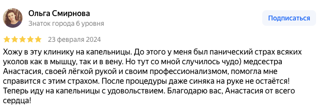 Хожу в эту клинику на капельницы. До этого у меня был панический страх всяких уколов как в мышцу, так и в вену. Но тут со мной случилось чудо) медсестра Анастасия, своей лёгкой рукой и своим профессионализмом, помогла мне справится с этим страхом. После процедуры даже синяка на руке не остаётся! Теперь иду на капельницы с удовольствием. Благодарю вас, Анастасия от всего сердца!