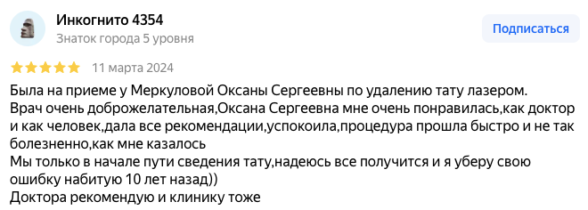 Яна Юрьвна, спасибо вам за прекрасную работу и доброе отношение. Удалила татуировку без проблем, кожный покров остался целостный. Вы классный врач, а ...