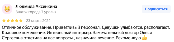 Отличное обслуживание. Приветливый персонал. Девушки улыбаются, располагают. Красивое помещение. Интересный интерьер. Замечательный доктор Олеся Сергеевна ответила на все вопросы , назначила лечение. Рекомендую ????
