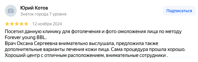 Посетил данную клинику для фотолечения и фото омоложения лица по методу Forever young BBL. Врач Оксана Сергеевна внимательно выслушала, предложила также дополнительные варианты лечения кожи лица. Сама процедура прошла хорошо. Хороший центр с отличным расположением, внимательные сотрудники .