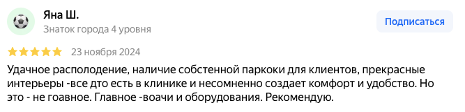 Удачное расположение, наличие собственной парковки для клиентов, прекрасные интерьеры -все это есть в клинике и несомненно создает комфорт и удобство. Но это - не главное. Главное -врачи и оборудования. Рекомендую.