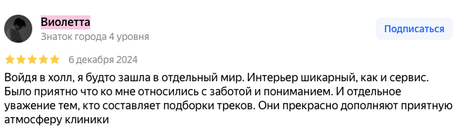 Войдя в холл, я будто зашла в отдельный мир. Интерьер шикарный, как и сервис. Было приятно что ко мне относились с заботой и пониманием. И отдельное уважение тем, кто составляет подборки треков. Они прекрасно дополняют приятную атмосферу клиники