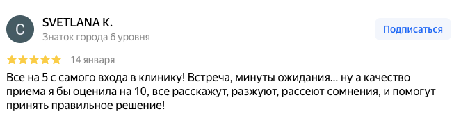 Все на 5 с самого входа в клинику! Встреча, минуты ожидания… ну а качество приема я бы оценила на 10, все расскажут, разжуют, рассеют сомнения, и помогут принять правильное решение!