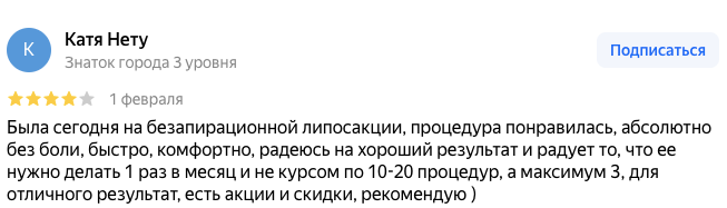 Была сегодня на безапирационной липосакции, процедура понравилась, абсолютно без боли, быстро, комфортно, радеюсь на хороший результат и радует то, что ее нужно делать 1 раз в месяц и не курсом по 10-20 процедур, а максимум 3, для отличного результат, есть акции и скидки, рекомендую )