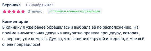 В клинику я уже ранее обращалась и выбрала её по расположению. На приёме внимательная девушка аккуратно провела процедуру, которая, наверное, уже помогла. Думаю, что в клинике крутой интерьер, и мне всё очень понравилось!