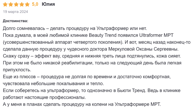 Если соберетесь на ультраформер, то однозначно в Бьюти Тренд. Ведь в клинике работают настоящие профессионалы.