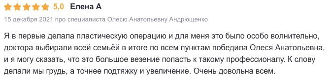 Я в первые делала пластическую операцию и для меня это было особо волнительно, доктора выбирали всей семьёй в итоге по всем пунктам победила Олеся Анатольевна, и я могу сказать, что это большое везение попасть к такому профессионалу. К слову делали мы грудь, а точнее подтяжку и увеличение. Очень довольна всем.