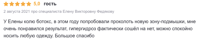 У Елены колю ботокс, в этом году попробовали проколоть новую зону-подмышки, мне очень понравился результат, гипергидроз фактически сошёл на нет, можно спокойно носить любую одежду. Большое спасибо