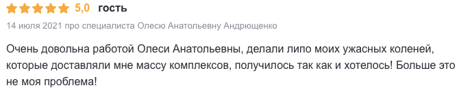 Очень довольна работой Олеси Анатольевны, делали липо моих ужасных коленей, которые доставляли мне массу комплексов, получилось так как и хотелось! Больше это не моя проблема!