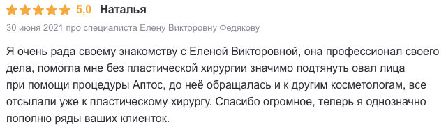 Я очень рада своему знакомству с Еленой Викторовной, она профессионал своего дела, помогла мне без пластической хирургии значимо подтянуть овал лица при помощи процедуры Аптос, до неё обращалась и к другим косметологам, все отсылали уже к пластическому хирургу. Спасибо огромное, теперь я однозначно пополню ряды ваших клиенток.