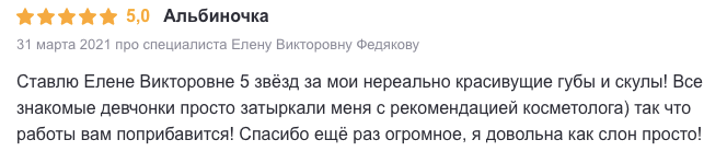 Ставлю Елене Викторовне 5 звёзд за мои нереально красивущие губы и скулы! Все знакомые девчонки просто затыркали меня с рекомендацией косметолога) так что работы вам поприбавится! Спасибо ещё раз огромное, я довольна как слон просто!
