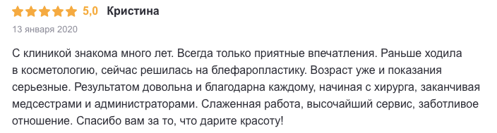 С клиникой знакома много лет. Всегда только приятные впечатления. Раньше ходила в косметологию, сейчас решилась на блефаропластику. Возраст уже и показания серьезные. Результатом довольна и благодарна каждому, начиная с хирурга, заканчивая медсестрами и администраторами. Слаженная работа, высочайший сервис, заботливое отношение. Спасибо вам за то, что дарите красоту!