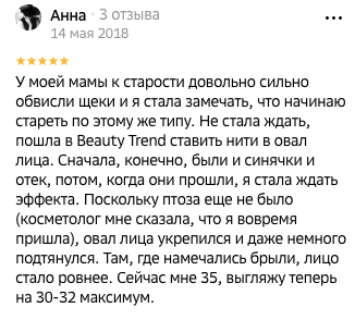 У моей мамы к старости довольно сильно обвисли щеки и я стала замечать, что начинаю стареть по этому же типу. Не стала ждать, пошла в Beauty Trend ставить нити в овал лица. Сначала, конечно, были и синячки и отек, потом, когда они прошли, я стала ждать эффекта. Поскольку птоза еще не было (косметолог мне сказала, что я вовремя пришла), овал лица укрепился и даже немного подтянулся. Там, где намечались брыли, лицо стало ровнее. Сейчас мне 35, выгляжу теперь на 30-32 максимум