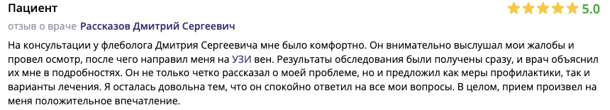На консультации у флеболога Дмитрия Сергеевича мне было комфортно. Он внимательно выслушал мои жалобы и провел осмотр, после чего направил меня на УЗИ вен. Результаты обследования были получены сразу, и врач объяснил их мне в подробностях. Он не только четко рассказал о моей проблеме, но и предложил как меры профилактики, так и варианты лечения. Я осталась довольна тем, что он спокойно ответил на все мои вопросы. В целом, прием произвел на меня положительное впечатление.
