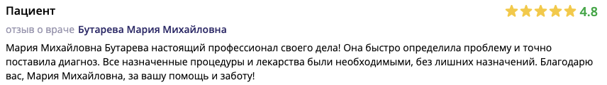 Мария Михайловна Бутарева настоящий профессионал своего дела! Она быстро определила проблему и точно поставила диагноз. Все назначенные процедуры и лекарства были необходимыми, без лишних назначений. Благодарю вас, Мария Михайловна, за вашу помощь и заботу