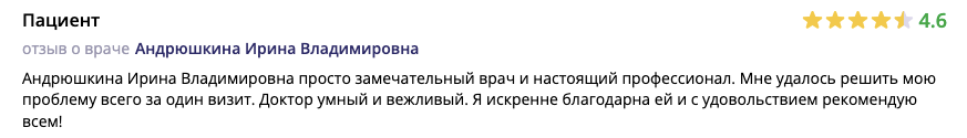 Андрюшкина Ирина Владимировна просто замечательный врач и настоящий профессионал. Мне удалось решить мою проблему всего за один визит. Доктор умный и вежливый. Я искренне благодарна ей и с удовольствием рекомендую всем!
