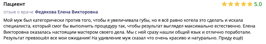 Мой муж был категорически против того, чтобы я увеличивала губы, но я всё равно хотела это сделать и искала специалиста, который смог бы выполнить процедуру так, чтобы результат выглядел максимально естественно. Елена Викторовна оказалась настоящим мастером своего дела. Мы с ней сразу нашли общий язык и отлично поработали. Результат превзошёл все мои ожидания! На удивление муж сказал что очень красиво и натурально. Приду ещё)