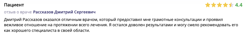Дмитрий Рассказов оказался отличным врачом, который предоставил мне грамотные консультации и проявил вежливое отношение на протяжении всего лечения. Я остался доволен результатами и могу смело рекомендовать его как хорошего специалиста в своей области.