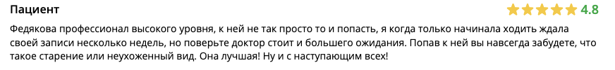 Федякова профессионал высокого уровня, к ней не так просто то и попасть, я когда только начинала ходить ждала своей записи несколько недель, но поверьте доктор стоит и большего ожидания. Попав к ней вы навсегда забудете, что такое старение или неухоженный вид. Она лучшая! Ну и с наступающим всех!