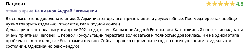 Делала риносептопластику в апреле 2021 года, врач - Кашманов Андрей Евгеньевич. Как отличный профессионал, так и очень приятный человек. С первой консультации перестала волноваться и полностью доверилась. Ни на одном этапе проблем не возникало, все было замечательно. Сейчас прошло еще меньше года, а носик уже почти в идеальном состоянии. Однозначно рекомендую!