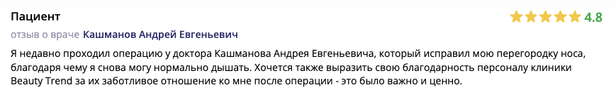 Я недавно проходил операцию у доктора Кашманова Андрея Евгеньевича, который исправил мою перегородку носа, благодаря чему я снова могу нормально дышать. Хочется также выразить свою благодарность персоналу клиники Beauty Trend за их заботливое отношение ко мне после операции - это было важно и ценно.