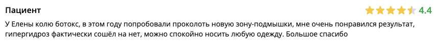 У Елены колю ботокс, в этом году попробовали проколоть новую зону-подмышки, мне очень понравился результат, гипергидроз фактически сошёл на нет, можно спокойно носить любую одежду. Большое спасибо