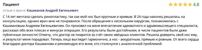 С 14 лет мечтала сделать ринопластику, так как мой нос был крупным и кривым. В 24 года наконец решилась на консультацию, однако врач мне не понравился. После обращения к нескольким хирургам, познакомилась с Кашмановым Андреем Евгеньевичем. Он произвел на меня впечатление адекватного и здравомыслящего специалиста, рассказал обо всех плюсах и минусах операции. Его результаты были достойными, в числе пациентов были даже публичные личности! Отмечу, что доктор не пиарится за счёт своих звёздных клиентов. Решила доверить свой нос ему, и результат меня порадовал. Теперь лицо выглядит гармонично, а нос - аккуратным, прямым и ровным. От всего сердца благодарю доктора Кашманова и рекомендую его всем, кто столкнулся с аналогичной проблемой.