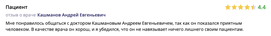 Мне понравилось общаться с доктором Кашмановым Андреем Евгеньевичем, так как он показался приятным человеком. В качестве врача он хорош, и я убедился, что он не навязывает ничего лишнего своим пациентам.