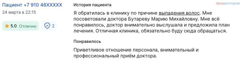 Я обратилась в клинику по причине выпадения волос. Мне посоветовали доктора Бутареву Марию Михайловну. Мне всё понравилось, доктор внимательно выслушала и предложила план лечения. Отличная клиника, обязательно буду сюда обращаться.