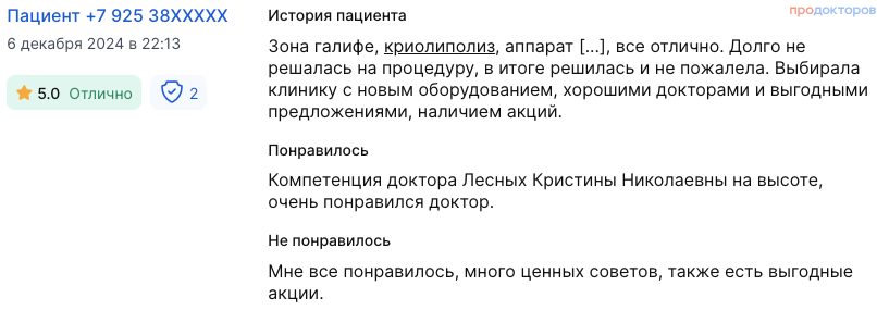 Зона галифе, криолиполиз, все отлично. Долго не решалась на процедуру, в итоге решилась и не пожалела. Выбирала клинику с новым оборудованием, хорошими докторами и выгодными предложениями, наличием акций.