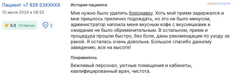 Мне нужно было удалить бородавку. Хоть мой прием задержался и мне пришлось прилично подождать, но это не было минусом, администратор напоила меня вкусным кофе с вкусняшками и ожидание не было обременительным. В остальном, прием и процедура прошли быстро, без боли, даны рекомендации по уходу за раной. Я осталась очень довольна. Большое спасибо данному заведению, все на высоте!