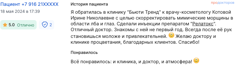 Я обратилась в клинику "Бьюти Тренд" к врачу-косметологу Котовой Ирине Николаевне с целью скорректировать мимические морщины в области лба и глаз. Сделали инъекции препаратом "Релатокс". Отличный доктор. Знакомы с ней не первый год. Всегда после её рук становишься моложе и привлекательней. :) Желаю доктору и клинике процветания, благодарных клиентов. Спасибо!