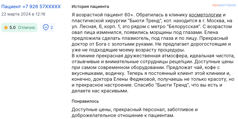Я возрастной пациент 60+. Обратилась в клинику косметологии и пластической хирургии "Бьюти Тренд", кот. находится в г. Москва, на ул. Лесная, 6, корп. 1, это рядом с метро "Белорусская". С возрастом овал лица изменился, появились морщины под глазами. Елена предложила сделать плазмогель, под глаза и по лицу. Прекрасный доктор от Бога с золотыми руками. Не предлагает дорогостоящие и уже не подходящие моему возрасту процедуры.