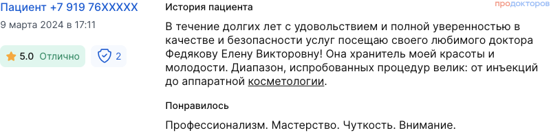 В течение долгих лет с удовольствием и полной уверенностью в качестве и безопасности услуг посещаю своего любимого доктора Федякову Елену Викторовну! Она хранитель моей красоты и молодости. Диапазон, испробованных процедур велик: от инъекций до аппаратной косметологии