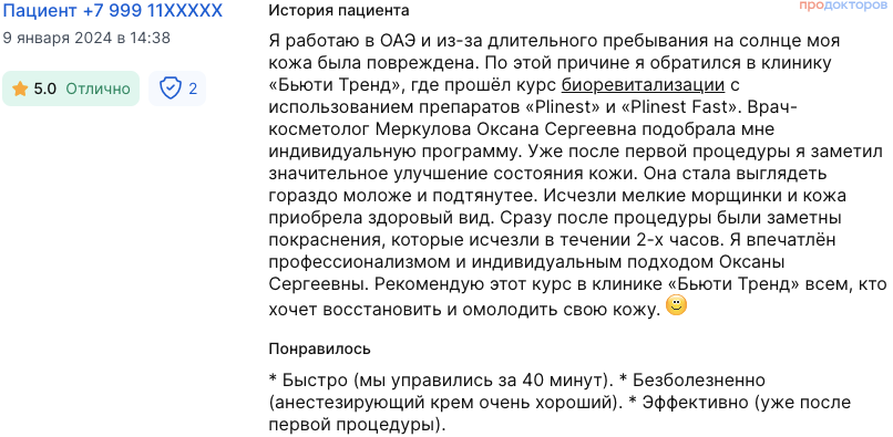 Я работаю в ОАЭ и из-за длительного пребывания на солнце моя кожа была повреждена. По этой причине я обратился в клинику «Бьюти Тренд», где прошёл курс биоревитализации с использованием препаратов «Plinest» и «Plinest Fast». Врач-косметолог Меркулова Оксана Сергеевна подобрала мне индивидуальную программу. Уже после первой процедуры я заметил значительное улучшение состояния кожи. Она стала выглядеть гораздо моложе и подтянутее. Исчезли мелкие морщинки и кожа приобрела здоровый вид. Сразу после процедуры были заметны покраснения, которые исчезли в течении 2-х часов. Я впечатлён профессионализмом и индивидуальным подходом Оксаны Сергеевны. Рекомендую этот курс в клинике «Бьюти Тренд» всем, кто хочет восстановить и омолодить свою кожу. :)