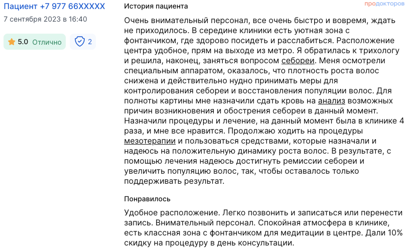 Очень внимательный персонал, все очень быстро и вовремя, ждать не приходилось. В середине клиники есть уютная зона с фонтанчиком, где здорово посидеть и расслабиться. Расположение центра удобное, прям на выходе из метро. Я обратилась к трихологу и решила, наконец, заняться вопросом себореи. Меня осмотрели специальным аппаратом, оказалось, что плотность роста волос снижена и действительно нудно принимать меры для контролирования себореи и восстановления популяции волос. Для полноты картины мне назначили сдать кровь на анализ возможных причин возникновения и обострения себореи в данный момент. Назначили процедуры и лечение, на данный момент была в клинике 4 раза, и мне все нравится. Продолжаю ходить на процедуры мезотерапии и пользоваться средствами, которые назначали и надеюсь на положительную динамику роста волос. В результате, с помощью лечения надеюсь достигнуть ремиссии себореи и увеличить популяцию волос, так, чтобы оставалось только поддерживать результат.