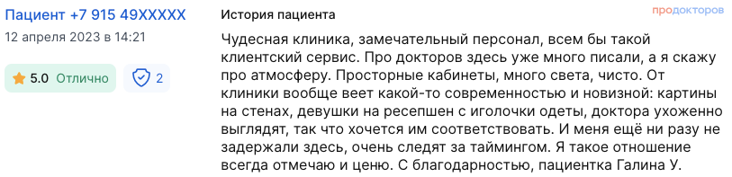 Чудесная клиника, замечательный персонал, всем бы такой клиентский сервис. Про докторов здесь уже много писали, а я скажу про атмосферу. Просторные кабинеты, много света, чисто. От клиники вообще веет какой-то современностью и новизной: картины на стенах, девушки на ресепшен с иголочки одеты, доктора ухоженно выглядят, так что хочется им соответствовать. И меня ещё ни разу не задержали здесь, очень следят за таймингом. Я такое отношение всегда отмечаю и ценю. С благодарностью, пациентка Галина У.
