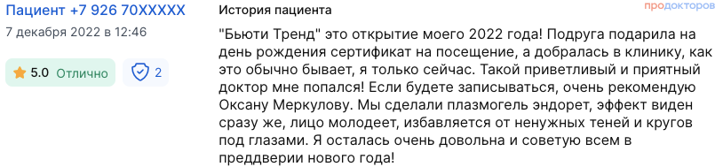 "Бьюти Тренд" это открытие моего 2022 года! Подруга подарила на день рождения сертификат на посещение, а добралась в клинику, как это обычно бывает, я только сейчас. Такой приветливый и приятный доктор мне попался! Если будете записываться, очень рекомендую Оксану Меркулову. Мы сделали плазмогель эндорет, эффект виден сразу же, лицо молодеет, избавляется от ненужных теней и кругов под глазами. Я осталась очень довольна и советую всем в преддверии нового года!