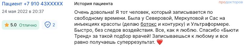 Очень довольна! Я тот человек, который записывается по свободному времени. Была у Северовой, Меркуловой и Сас на инъекциях красоты (делаю ботокс и контурку) и Ультраформере. Быстро, без следов воздействия. Все, как я люблю. Спасибо «Бьюти Тренд» за такой подбор врачей! Записываешься к любому и все равно получаешь суперрезультат.