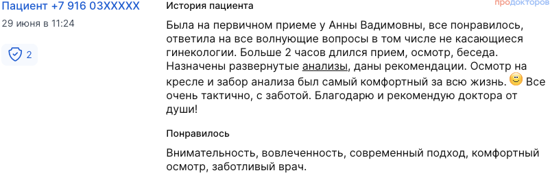 Была на первичном приеме у Анны Вадимовны, все понравилось, ответила на все волнующие вопросы в том числе не касающиеся гинекологии. Больше 2 часов длился прием, осмотр, беседа. Назначены развернутые анализы, даны рекомендации. Осмотр на кресле и забор анализа был самый комфортный за всю жизнь. :) Все очень тактично, с заботой. Благодарю и рекомендую доктора от души!