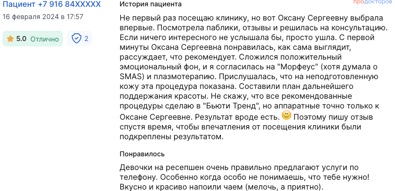 Не первый раз посещаю клинику, но вот Оксану Сергеевну выбрала впервые. Посмотрела паблики, отзывы и решилась на консультацию. Если ничего интересного не услышала бы, просто ушла. С первой минуты Оксана Сергеевна понравилась, как сама выглядит, рассуждает, что рекомендует. Сложился положительный эмоциональный фон, и я согласилась на "Морфеус" (хотя думала о SMAS) и плазмотерапию. Прислушалась, что на неподготовленную кожу эта процедура показана. Составили план дальнейшего поддержания красоты. Не скажу, что все рекомендованные процедуры сделаю в "Бьюти Тренд", но аппаратные точно только к Оксане Сергеевне. Результат вроде есть. :) Поэтому пишу отзыв спустя время, чтобы впечатления от посещения клиники были подкреплены результатом.