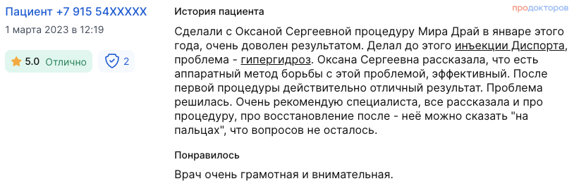 Сделали с Оксаной Сергеевной процедуру Мира Драй в январе этого года, очень доволен результатом. Делал до этого инъекции Диспорта, проблема - гипергид...