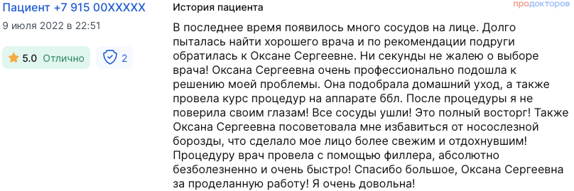 В последнее время появилось много сосудов на лице. Долго пыталась найти хорошего врача и по рекомендации подруги обратилась к Оксане Сергеевне. Ни секунды не жалею о выборе врача! Оксана Сергеевна очень профессионально подошла к решению моей проблемы. Она подобрала домашний уход, а также провела курс процедур на аппарате ббл. После процедуры я не поверила своим глазам! Все сосуды ушли! Это полный восторг! Также Оксана Сергеевна посоветовала мне избавиться от носослезной борозды, что сделало мое лицо более свежим и отдохнувшим! Процедуру врач провела с помощью филлера, абсолютно безболезненно и очень быстро! Спасибо большое, Оксана Сергеевна за проделанную работу! Я очень довольна!