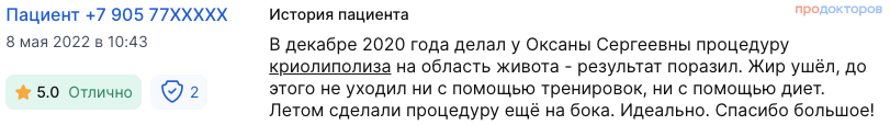 В декабре 2020 года делал у Оксаны Сергеевны процедуру криолиполиза на область живота - результат поразил. Жир ушёл, до этого не уходил ни с помощью тренировок, ни с помощью диет. Летом сделали процедуру ещё на бока. Идеально. Спасибо большое!