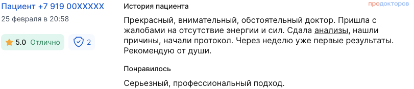 Прекрасный, внимательный, обстоятельный доктор. Пришла с жалобами на отсутствие энергии и сил. Сдала анализы, нашли причины, начали протокол. Через неделю уже первые результаты. Рекомендую от души.