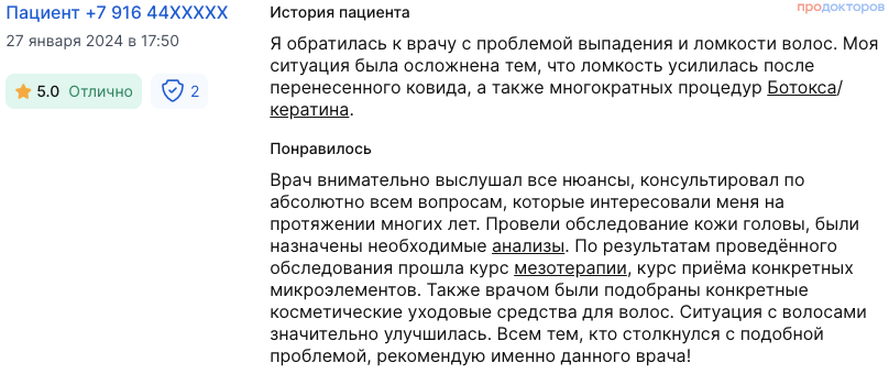Я обратилась к врачу с проблемой выпадения и ломкости волос. Моя ситуация была осложнена тем, что ломкость усилилась после перенесенного ковида, а также многократных процедур Ботокса/кератина.