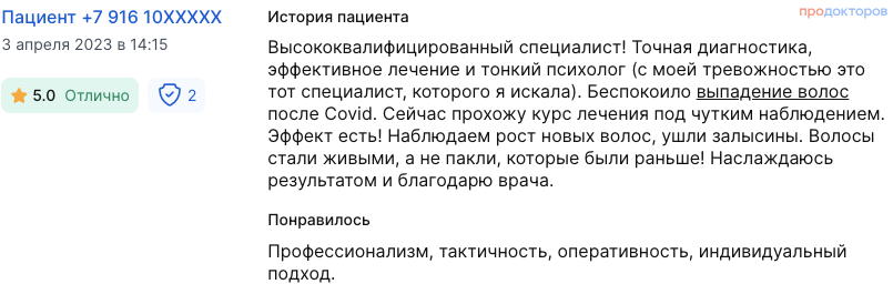Высококвалифицированный специалист! Точная диагностика, эффективное лечение и тонкий психолог (с моей тревожностью это тот специалист, которого я искала). Беспокоило выпадение волос после Covid. Сейчас прохожу курс лечения под чутким наблюдением. Эффект есть! Наблюдаем рост новых волос, ушли залысины. Волосы стали живыми, а не пакли, которые были раньше! Наслаждаюсь результатом и благодарю врача.